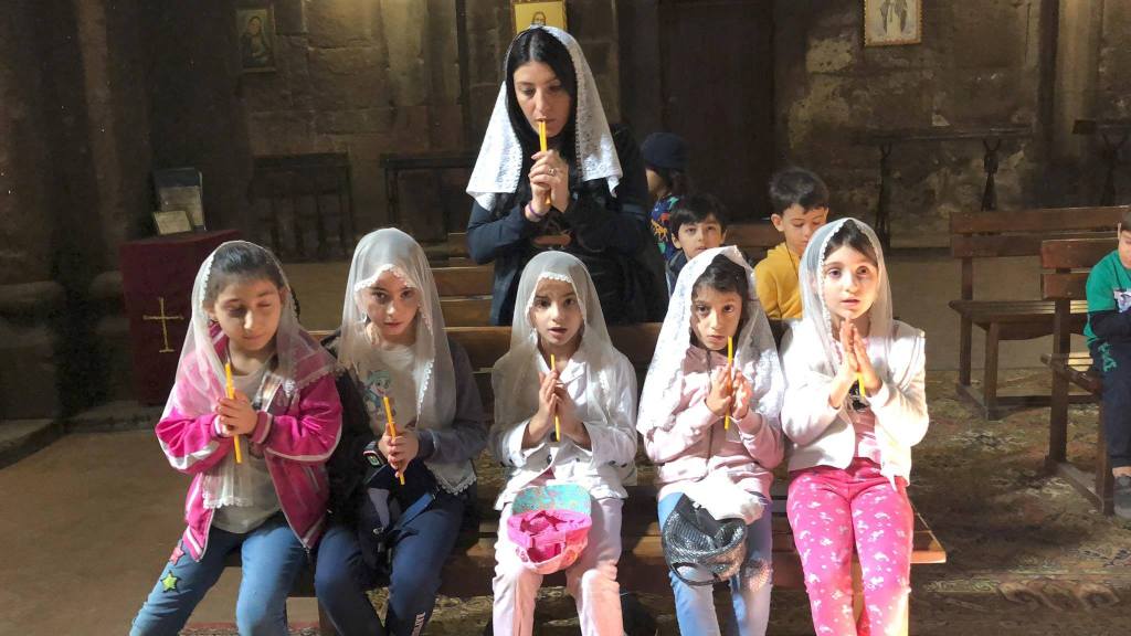 Սկզբում եղանքՍբ.Աստվածածին եկեղեցիում։ Եկեղեցին կառուցել է Գրիգոր Մագիստրոս Պահլավունին և, Պետրոս Ա Գետադարձ կաթողիկոսի ու Հովհաննես Սմբատ թագավորի հրամանով։ Եկեղեցու ներսում միասին աղոթեցինք և երգեցինք Հայր Մերը։