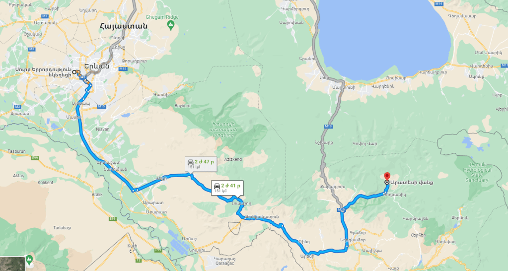 Երևանից Արատես — 153 կմ, Արատեսից- Վաղաշեն-67կմ , Վաղաշենից- Երևան -136 կմ